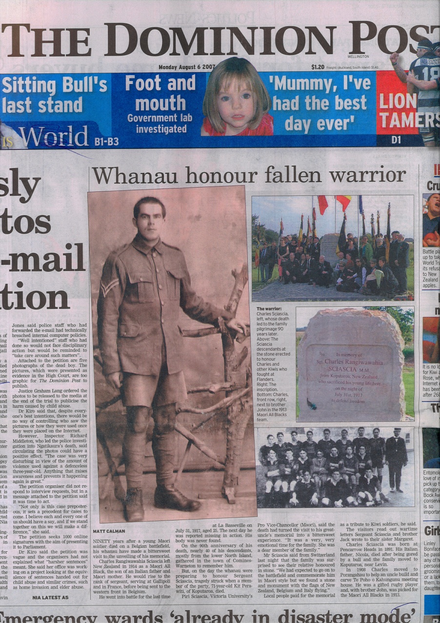 Uncle Sonny and our cousin Paolo Fulci the Ambassador have asked me to provide some additional information about the Memorial to our uncle and grand-uncle Charles Rangiwawahia Sciascia at La Bassee-ville , Warnerton. This is in response to many of the questions asked by the whanau. There is a very good description on the web already.